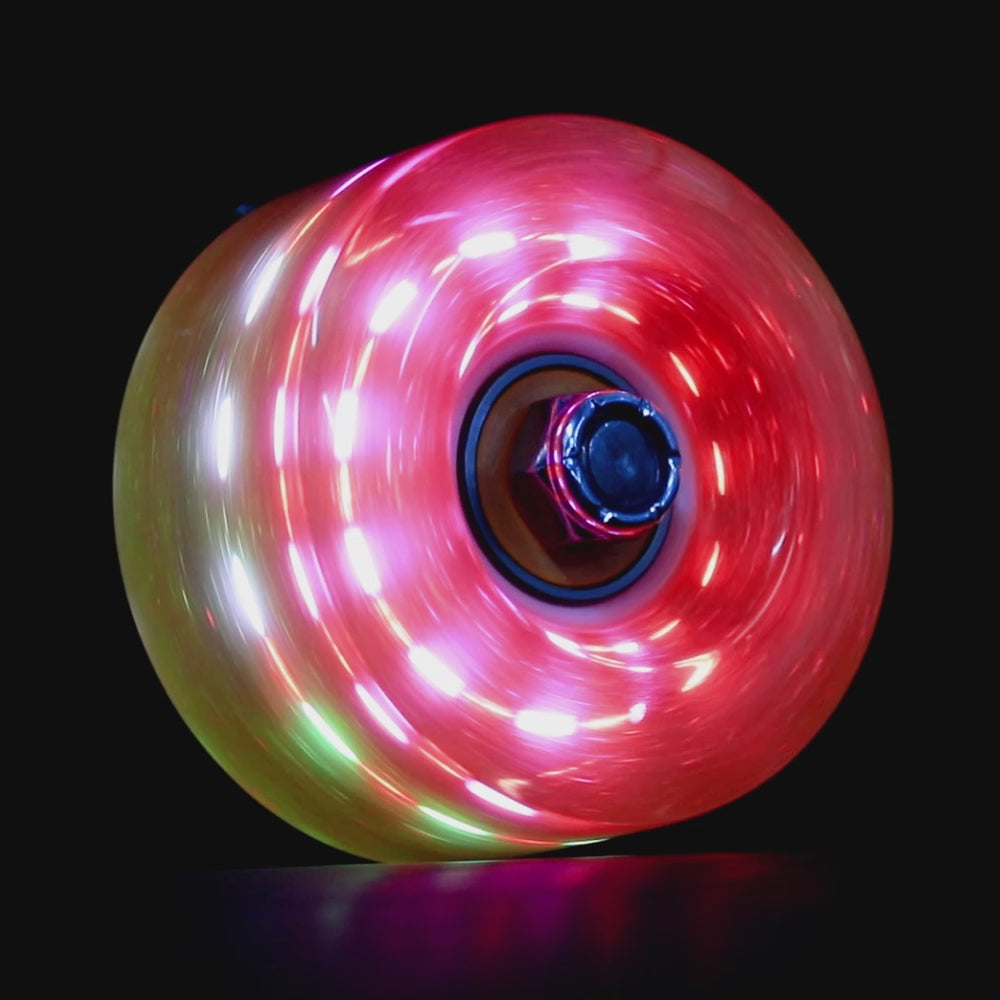 Red Yellow BRIGHTS feature a Silver Glitter within a dual semi transparent RED and YELOW urethane with super bright Red & White LEDs offering a multidimensional glow - you will not be missed rolling in these. BRIGHTS are not just light-up wheels, thy are a visual experience! Whether you’re lighting up the rink or rolling through the nights outside, these wheels are engineered and crafted for skating indoors or out - making these an ideal hybrid wheel.