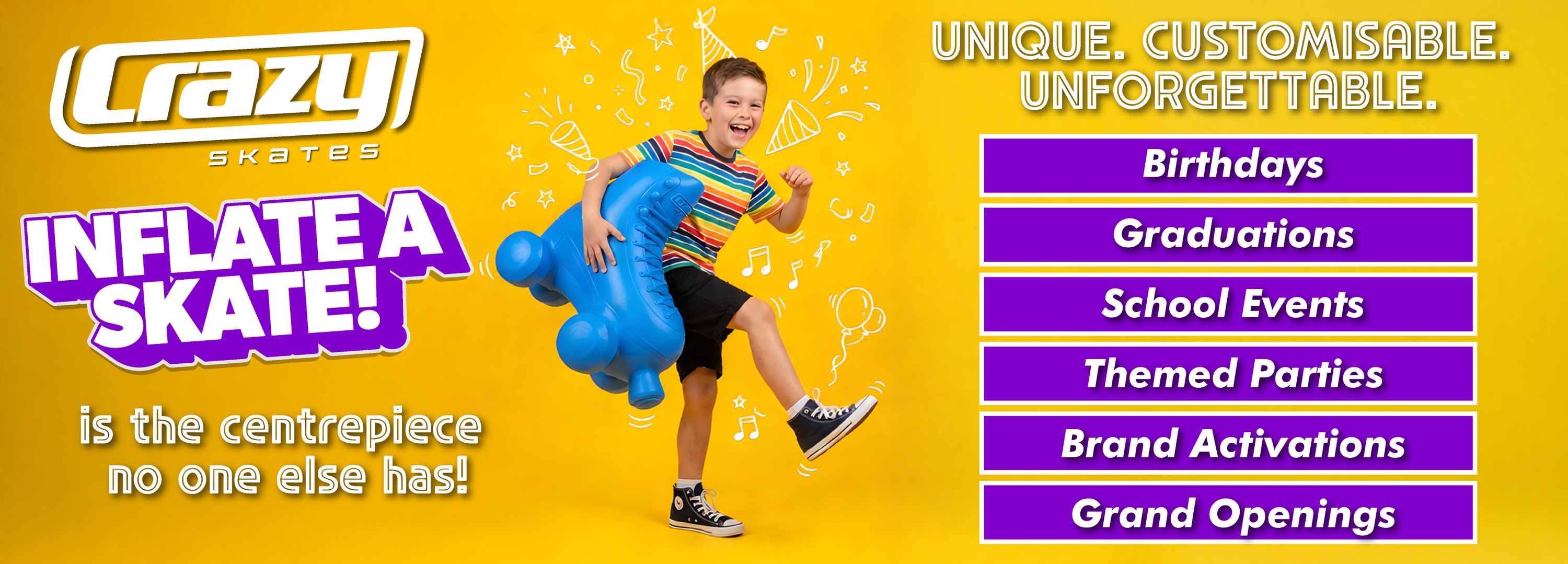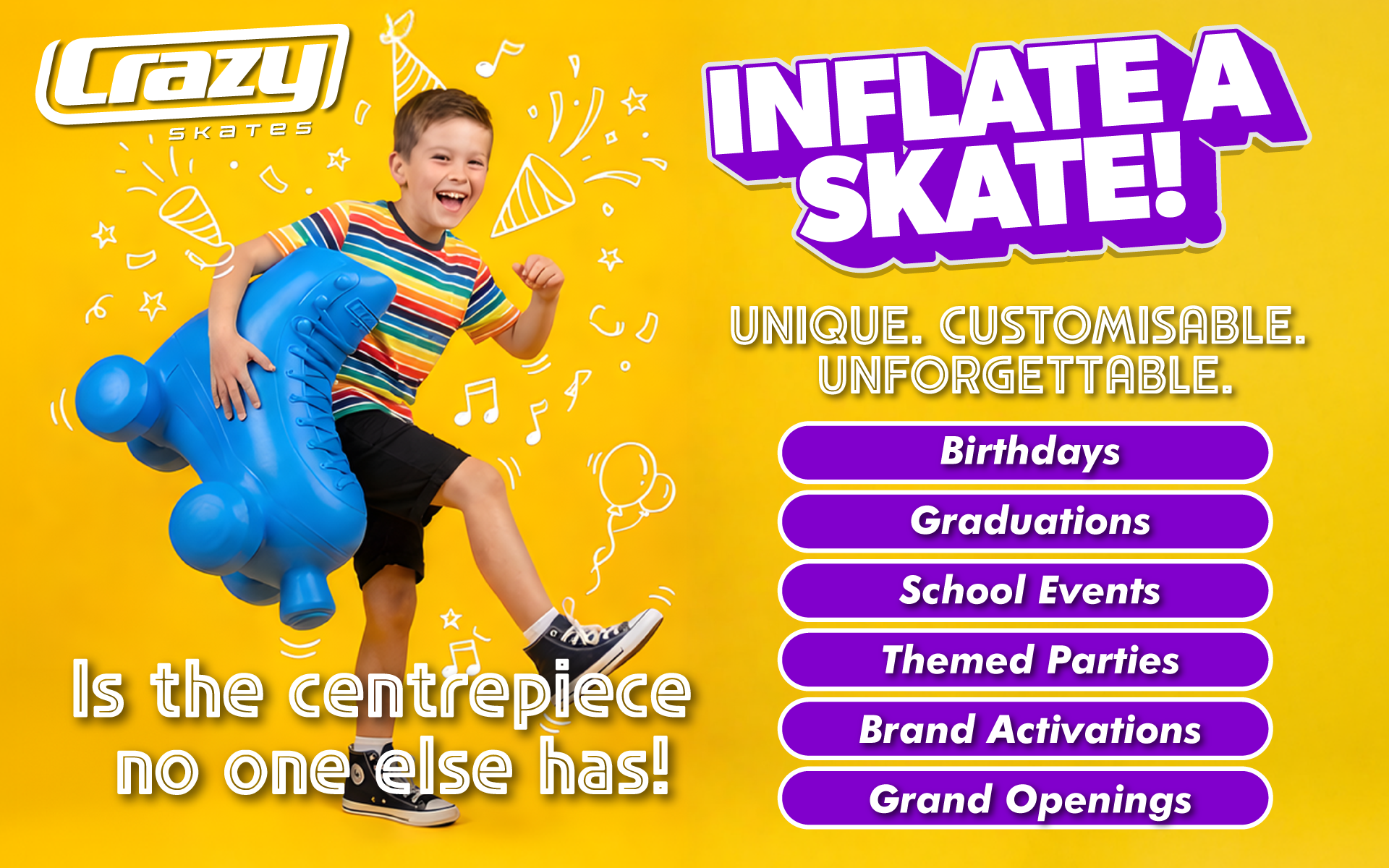 Turn every party into an unforgettable celebration with Inflate-A-Skate. A fun, interactive centrepiece that makes your event truly memorable