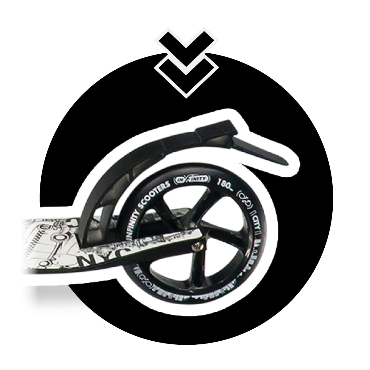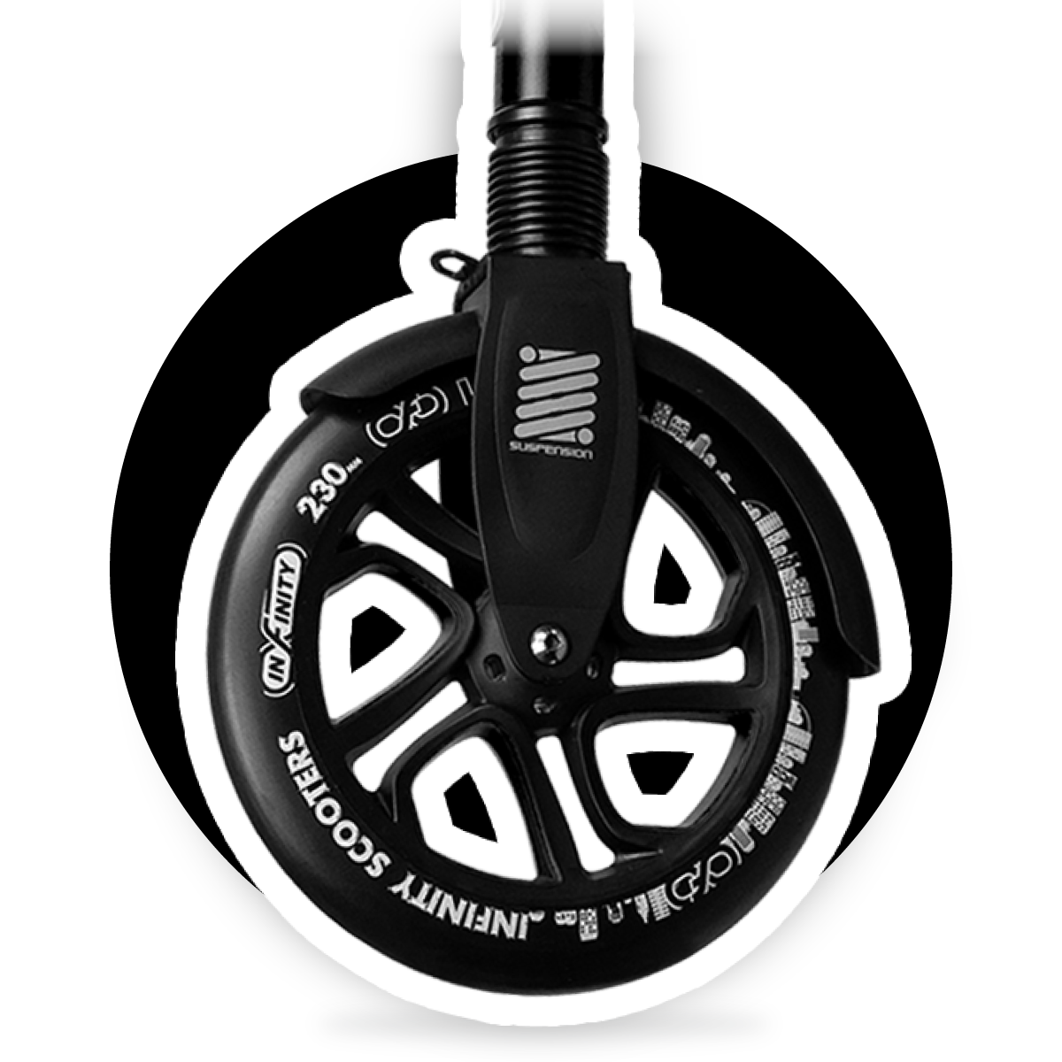 Oversized high-rebound wheels – a 230 mm front wheel and 180 mm rear wheel. These big wheels made of 82A durometer polyurethane maintain speed with less effort and easily glide over bumps or cracks, giving the scooter excellent cruising performance on city streets