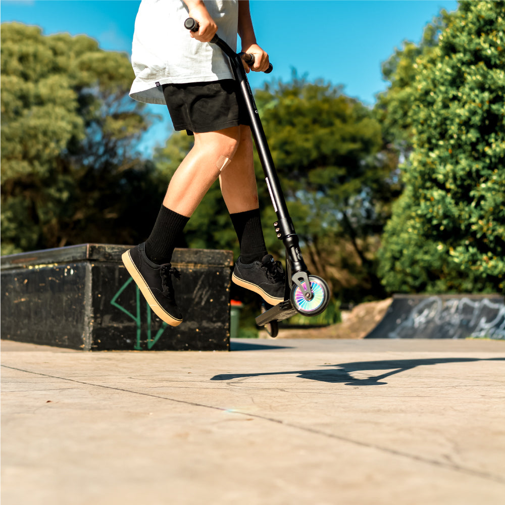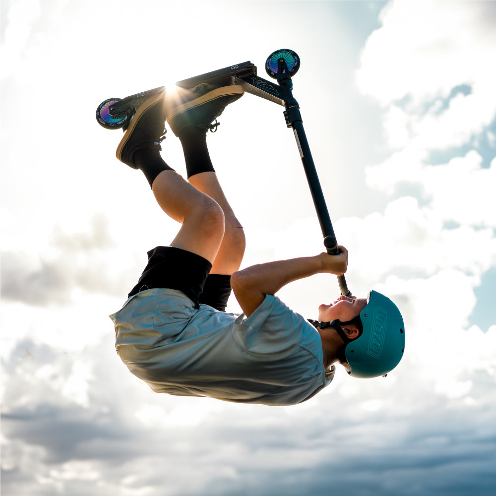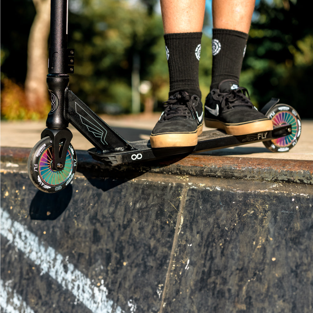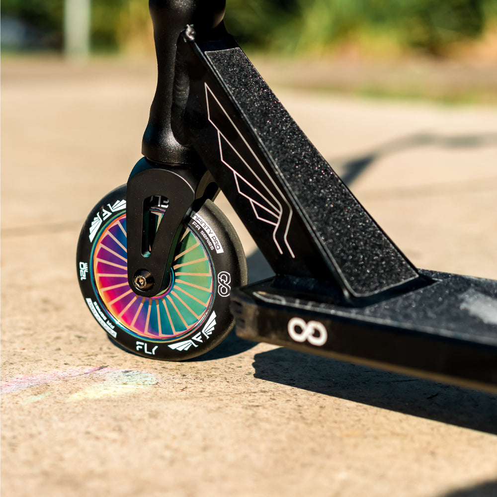 You will never get sick of 'air-time' when riding the all new FLY FreeRide FR Series Pro infinity Scooter. Arguably one of the most stylish and technically advanced scooters on the market for its price point, the FLY features our highest spec. components, including 120mm hollow core Turbine wheels, complimented perfectly by the large wing FLY graphics that have been laser engraved into the anodized blue finish on the deck. The sky is the limit - the FLY boasts superior style, ultimate rideability and exceptional components, look no further, FLY is the pro scooter for you!